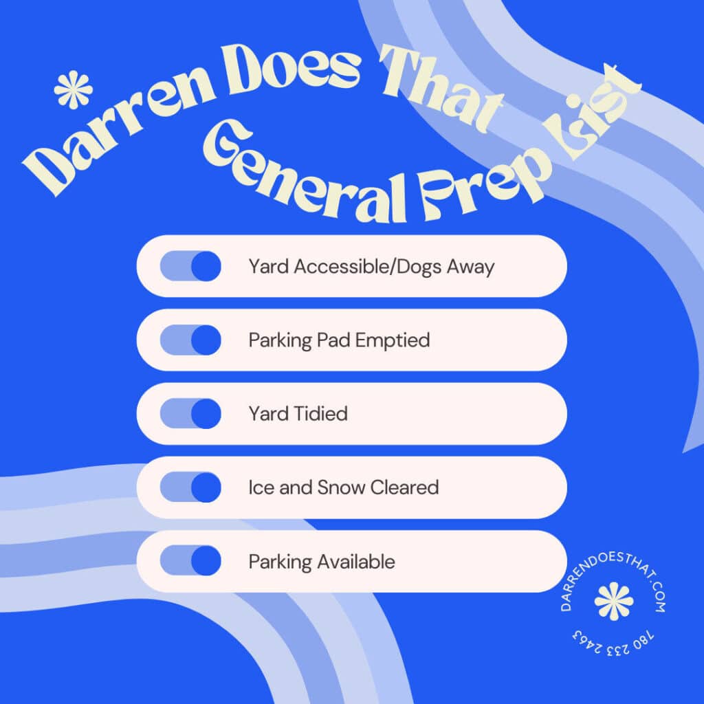 Snow and Ice Cleared: This is in the general prep list too… but it’s really important! We’ll bring salt and shovels along, but if there’s more to do than a cursory blowing off of snow in order for us to work safely, we’ll have to charge for snow removal time.