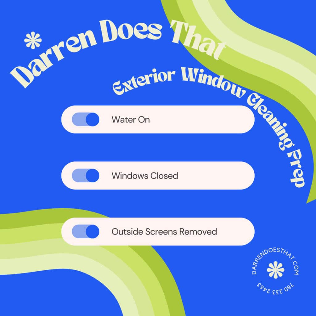 Remove Exterior Screens: Some screens are designed so they cannot be taken out from outside. Some screens that in theory can be taken out from outside are installed so tight we can’t get them out without risking damaging them. If you don’t take out your screens we’ll do our best, but if we can’t get them out without risking damage we’ll have to skip the glass in behind them. If you do take exterior screens out please set them outside for us and we’ll clean them up as part of the job!